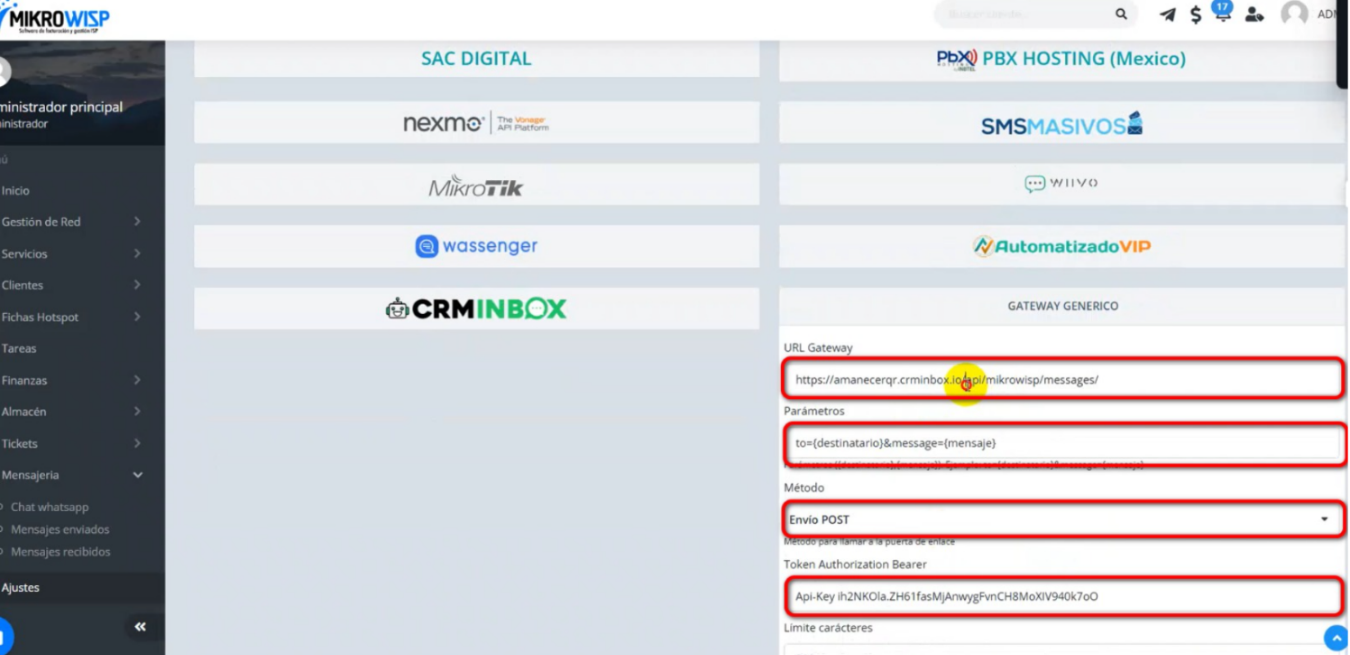 Guía para integrar MikroWisp con CRMInbox mediante Gateway de Mensajería
