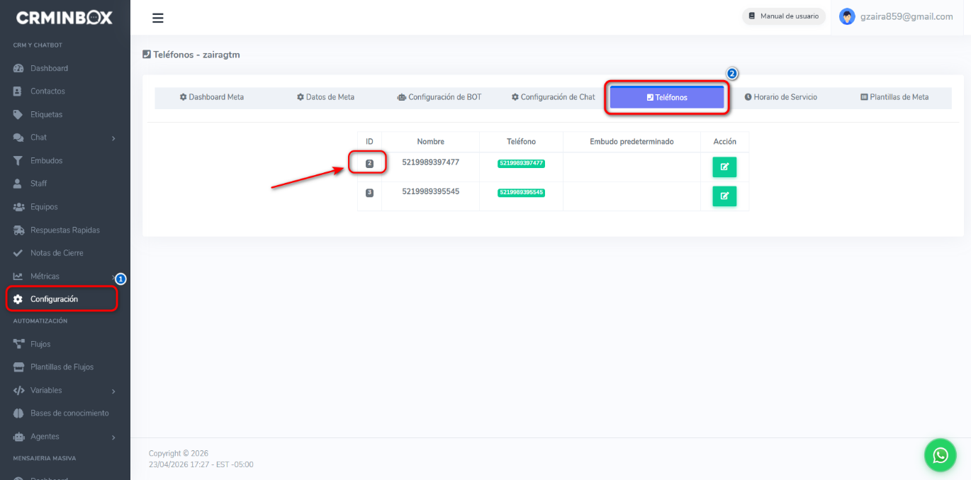 En CRMInbox, el WABA ID o identificador del número se puede consultar en el apartado de: