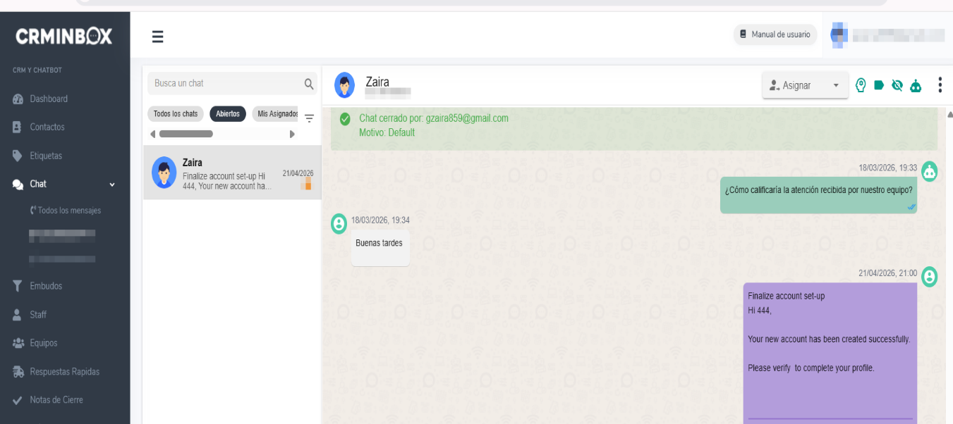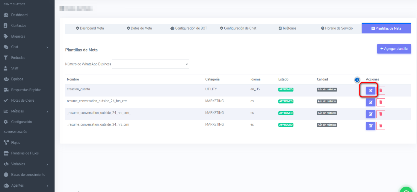 - Plantillas creadas y aprobadas en CRMInbox, según el caso.
